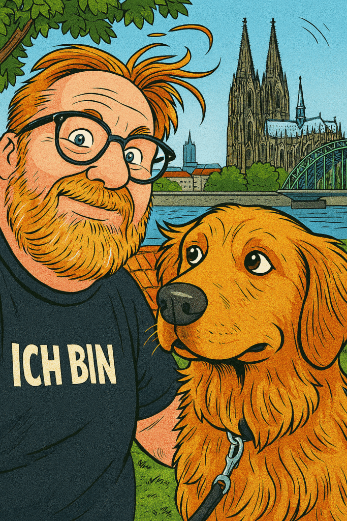 Ein Hund als Comic-Superheld, mit einem roten Umhang und einem blauen Hemd, fliegt über Köln. Der Kölner Dom und das Rhein-Panorama von Köln sind zu sehen.